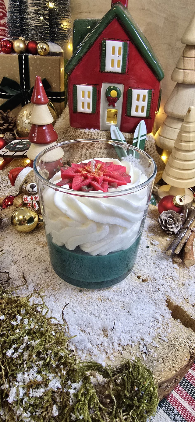 Symbole des fêtes et de la magie hivernale, la fleur d’hiver trône fièrement au sommet de cette bougie chantilly.