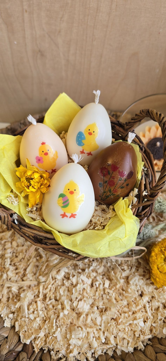 Craquez pour ce joli assortiment de 4 bougies en forme d’œufs, décorées à la main pour célébrer le printemps et la magie de Pâques.