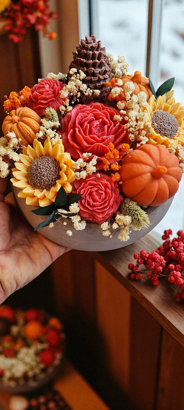 Un écrin automnal qui mêle l’éclat des tournesols, la chaleur des roses et la rondeur des petites citrouilles.