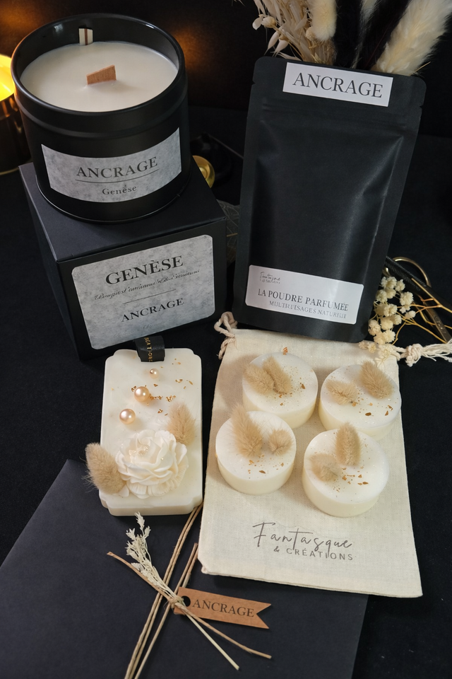 Chaque création est coulée et décorée à la main en cire végétale. Un même parfum décliné sous plusieurs formes pour accompagner vos rituels : flamme enveloppante, diffusion intense, parfum multi usage ou présence décorative.