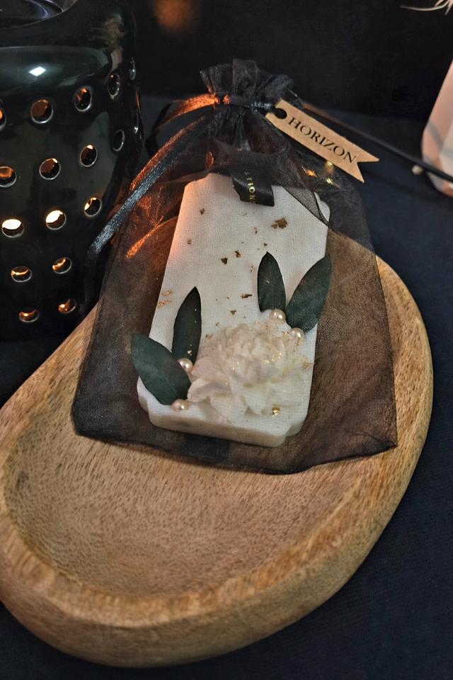 Un palet façonné à la main, orné de feuilles et d’éclats dorés, comme une promesse d’ouverture.